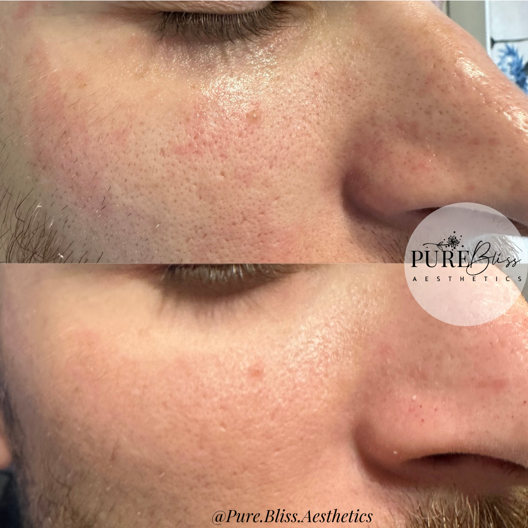 Before & after ONE Sylfirm X treatment. Photos taken about ten days apart. Acne scarring & texture significantly improved.